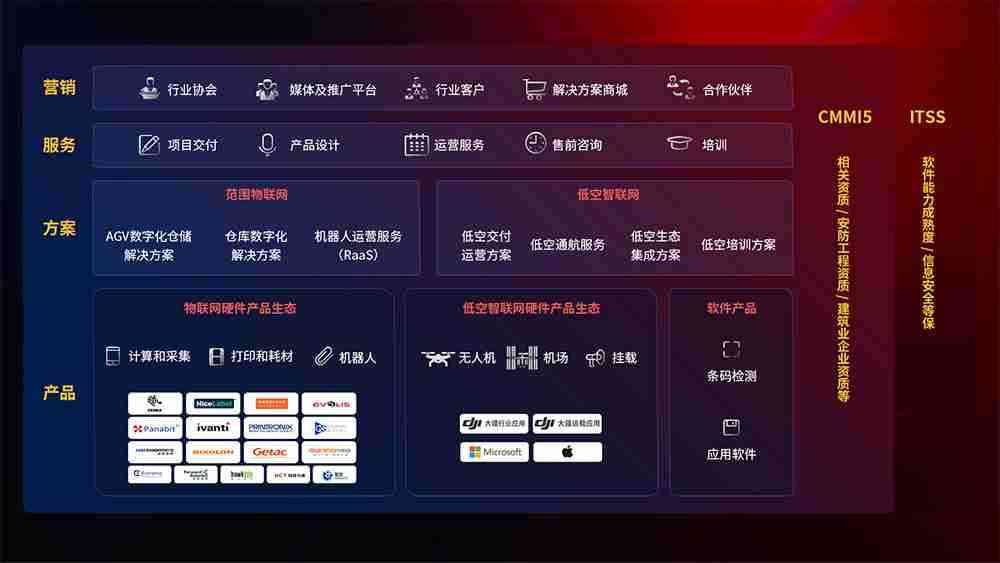聚合国内外先进的物联网硬件产品品牌,,聚焦数字化仓储、、机器人运营、、、低空智联网等领域,,,共同打造适合客户业务场景的解决方案并提供交付服务