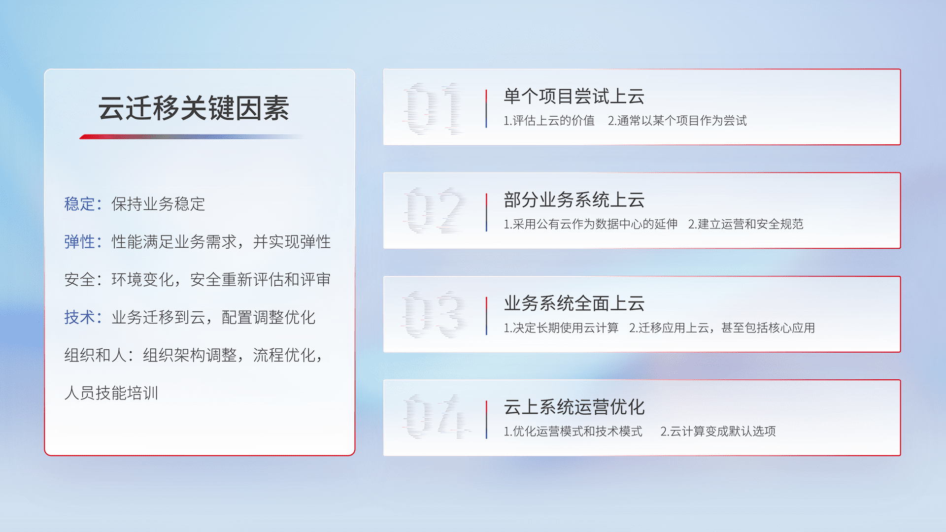 结合实际业务,,,,从规划设计、、、云平台选型、、、云原生改造、、、、数据迁移、、、、集成交付,,,,迁移全过程为客户识别最佳上云路径,,,,做好风险识别管理,,设计网络架构、、、、身份权限、、、、安全审计合规、、、、操作审计、、、日志审计、、监控告警策略、、、多站点容灾设计等,,,,对云上基础设施进行整体规划,,,提升IT治理水平,,,,以满足弹性、、、高可用、、、、高性能的需求。。。。