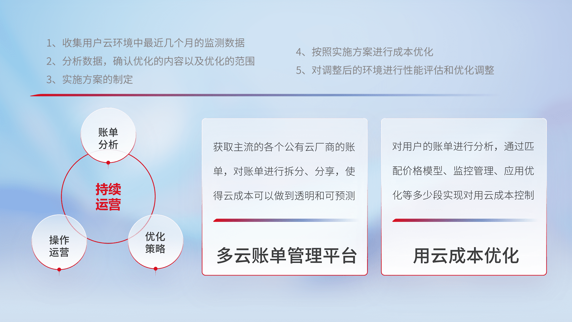 通过多云纳管,,,,以统一的资源数据模型把客户的云资源进行抽象和封装,,,进而实现对多云资源的统一操作,,,保障云资源管理的可靠性、、、、稳定性与可用性。。。。量身定制化运维内容,,配置、、开发运维、、、补丁管理、、、、备份、、监控、、认证和访问管理、、审计和日常巡检等,,保障在用云过程中的可靠度,,稳定度以及高可用率。。。